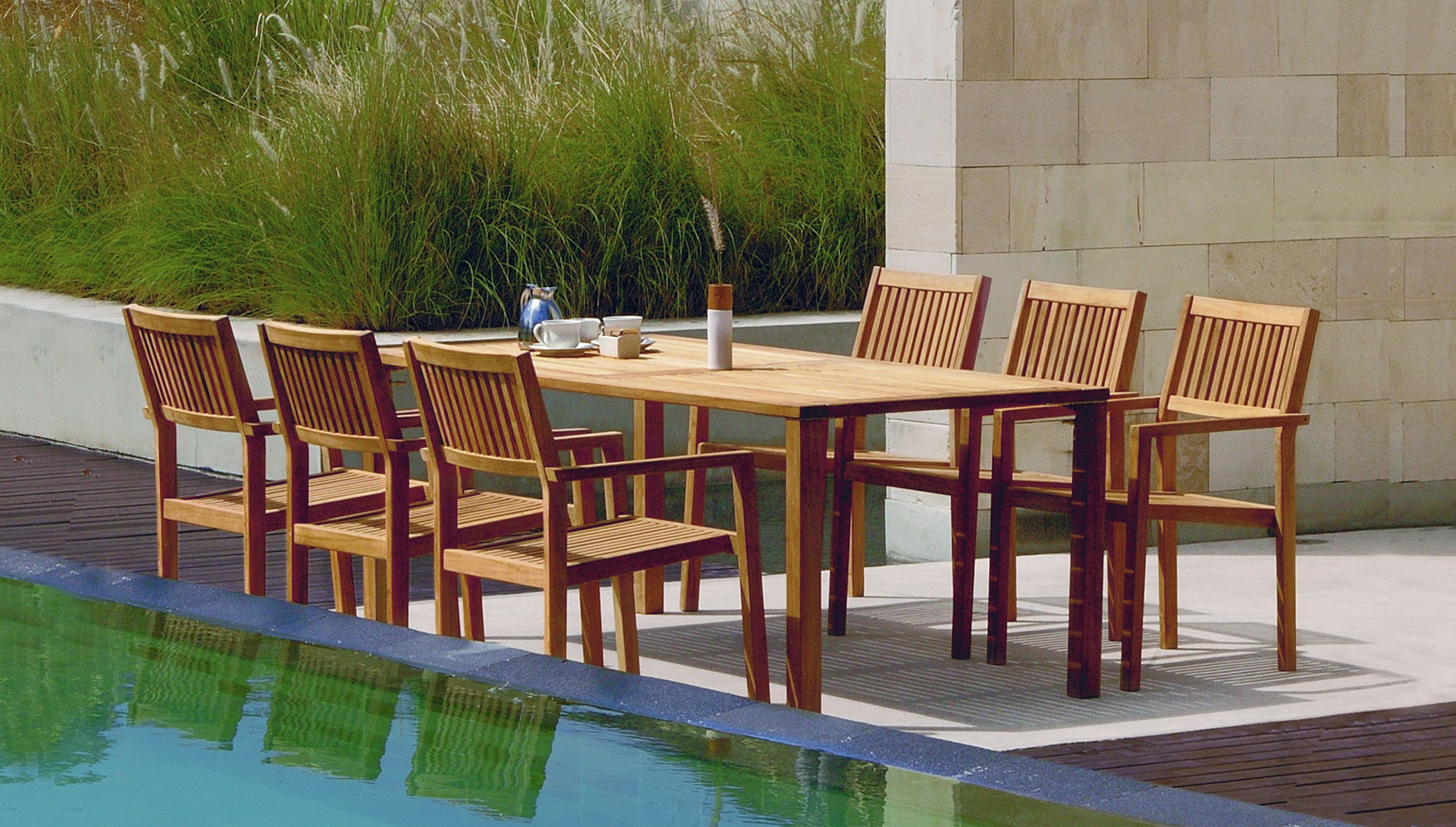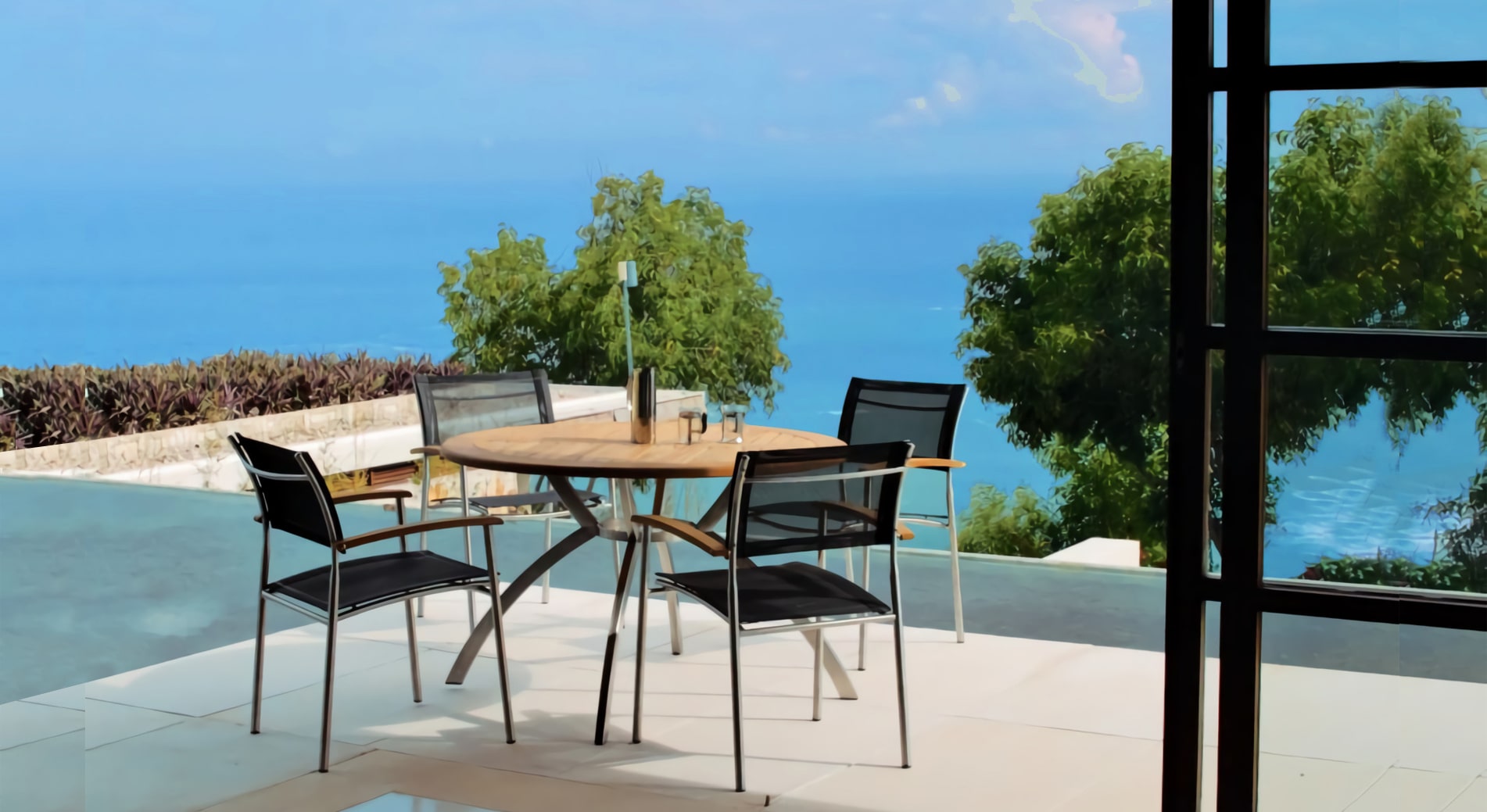 This represents our most comprehensive collection whilst teak and brushed stainless steel are the main theme, we are also now include pieces incorporating new durable materials such as Batyline® –woven vynil (a light weight, tough and easy to clean material, excellent resistance to ultraviolet radiation, withstand fading, and mildew), resilient Hularo® wicker, anodized & powder coated aluminium frame that guarantee years of carefree interior or garden enjoyment.